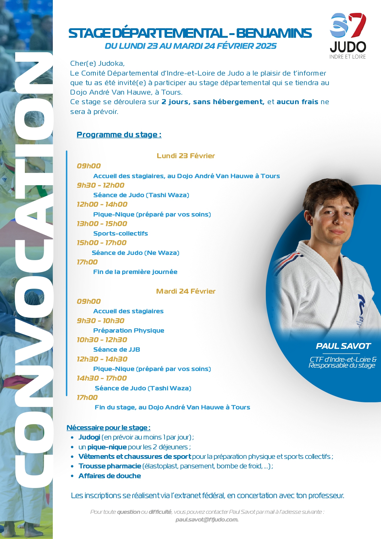 Lieu : Complexe sportif 2 rue Jules Ladoumègue 37000 TOURS (Dojo municipal André Van Hauwe)